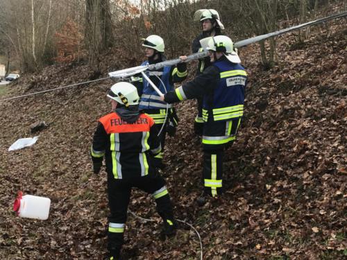 Die Feuerwehren Aura, Mittelsinn und Obersinn wurden am Morgen des 20.2.2019 zu einem Fahrzeugbrand auf der Ortsverbindungsstraße zwischen Aura und Mittelsinn alarmiert. Nach einem Verkehrsunfall, an dem ein PKW und ein Kleintransporter beteiligt waren, sei an einem der Fahrzeuge Qualm zu erkennen. Beim Eintreffen an der Einsatzstelle stellte sich jedoch heraus, dass es sich lediglich um dampfende Batteriesäure handelte, die aus der beschädigten Batterie des Kleintransporters auslief.