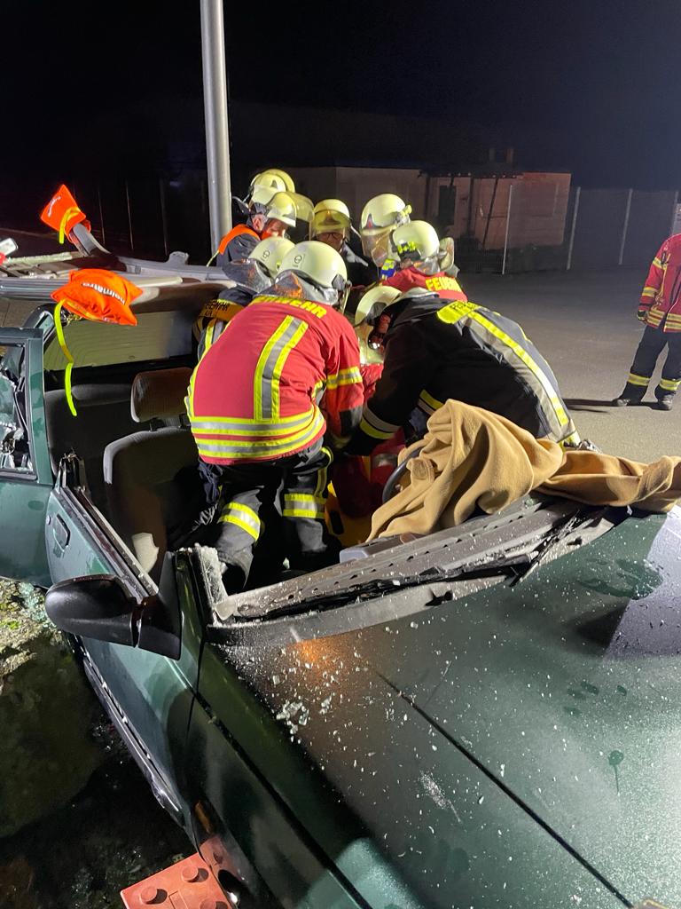 Nachdem wir einen Zugang zum Patienten schaffen konnten wurde eine weitere verletzte Person im Fahrzeug entdeckt. Ein Kleinkind, das beim Aufprall unter den Fahrersitz geschleudert wurde. Nachdem wir den Stapler aus dem Weg schaffen konnten, konnte mit der technischen Rettung der im Fahrzeug befindlichen Personen begonnen werden.